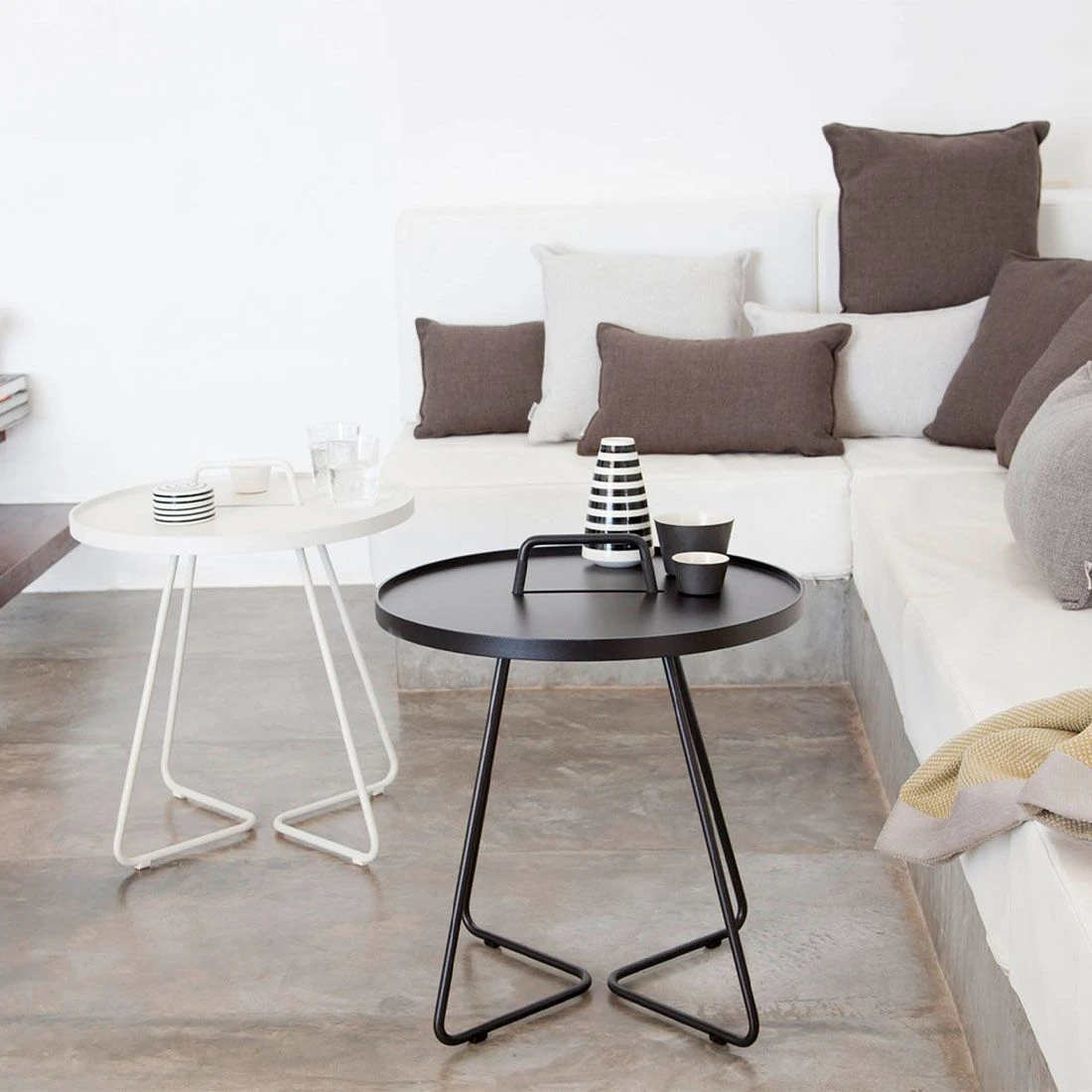 Sein komprimiertes Design macht den Beistelltisch On-the-move von Cane-Line zu einer hervorragenden Ergänzung eines Loungesets auf dem Balkon.