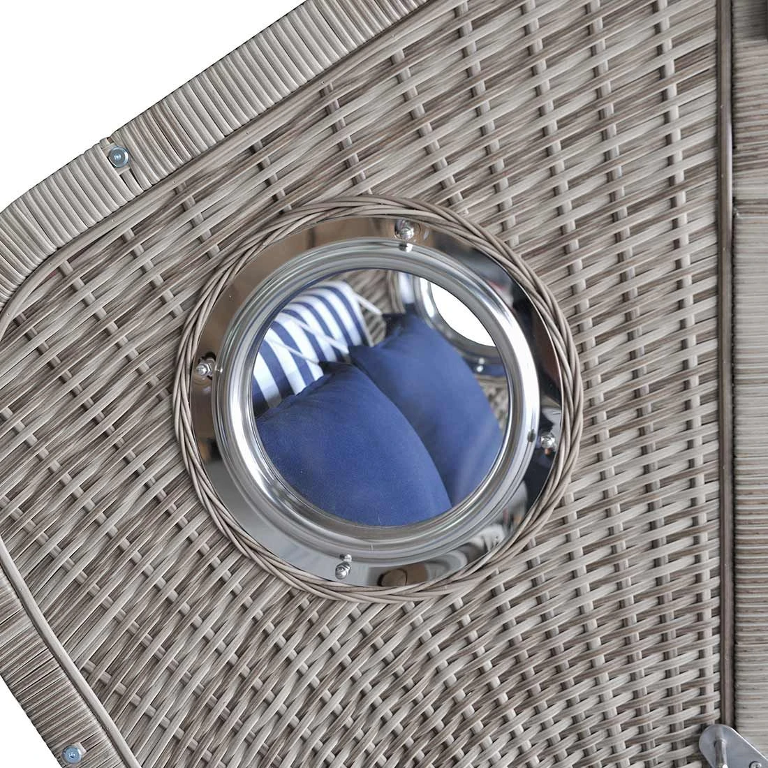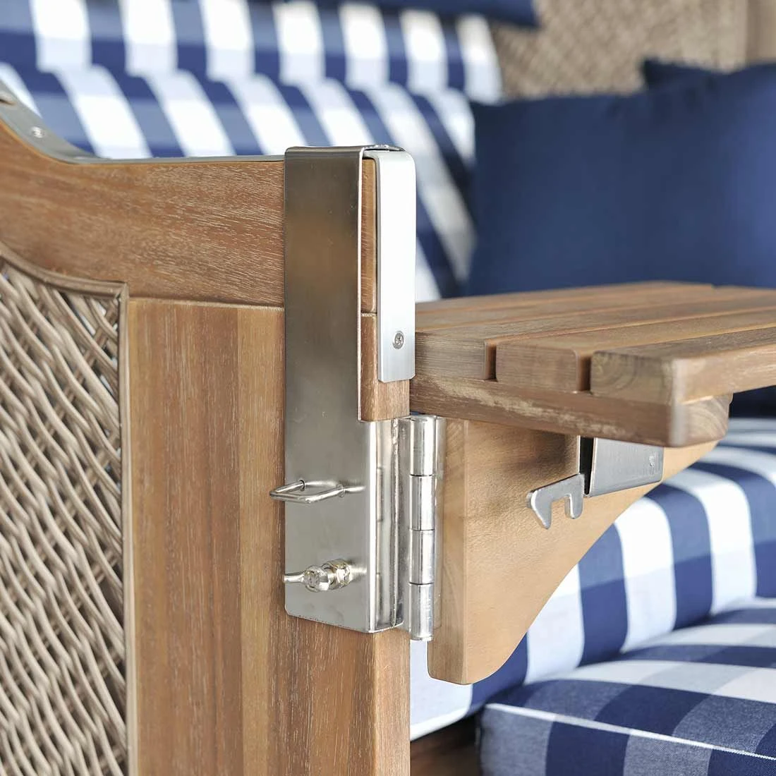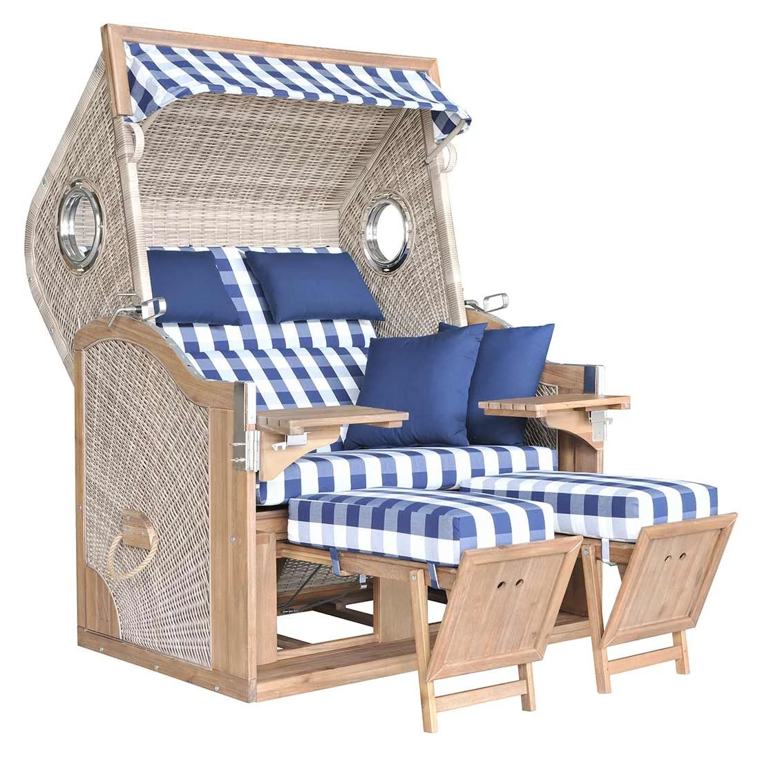 Der Strandkorb selbst besteht aus Akazienholz sowie Polyrattan-Geflecht. Beides harmoniert hervorragend miteinander. Das Grundgerüst des Strandkorbs ist in Braun gehalten. Darüber hinaus begeistert der Strandkorb Pure Greenline im Farbton Braun. Als weiterer Hingucker und komfortables Highlight fungiert die Sitzfläche (Blau-Weiß). Zusammen mit den anderen Bestandteilen des Strandkorbs ergibt sich ein harmonisches Gesamtbild.