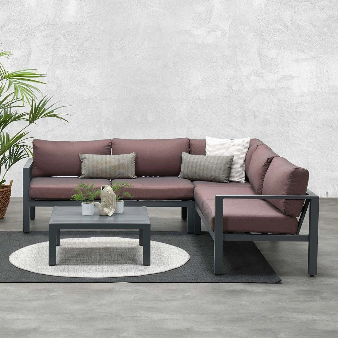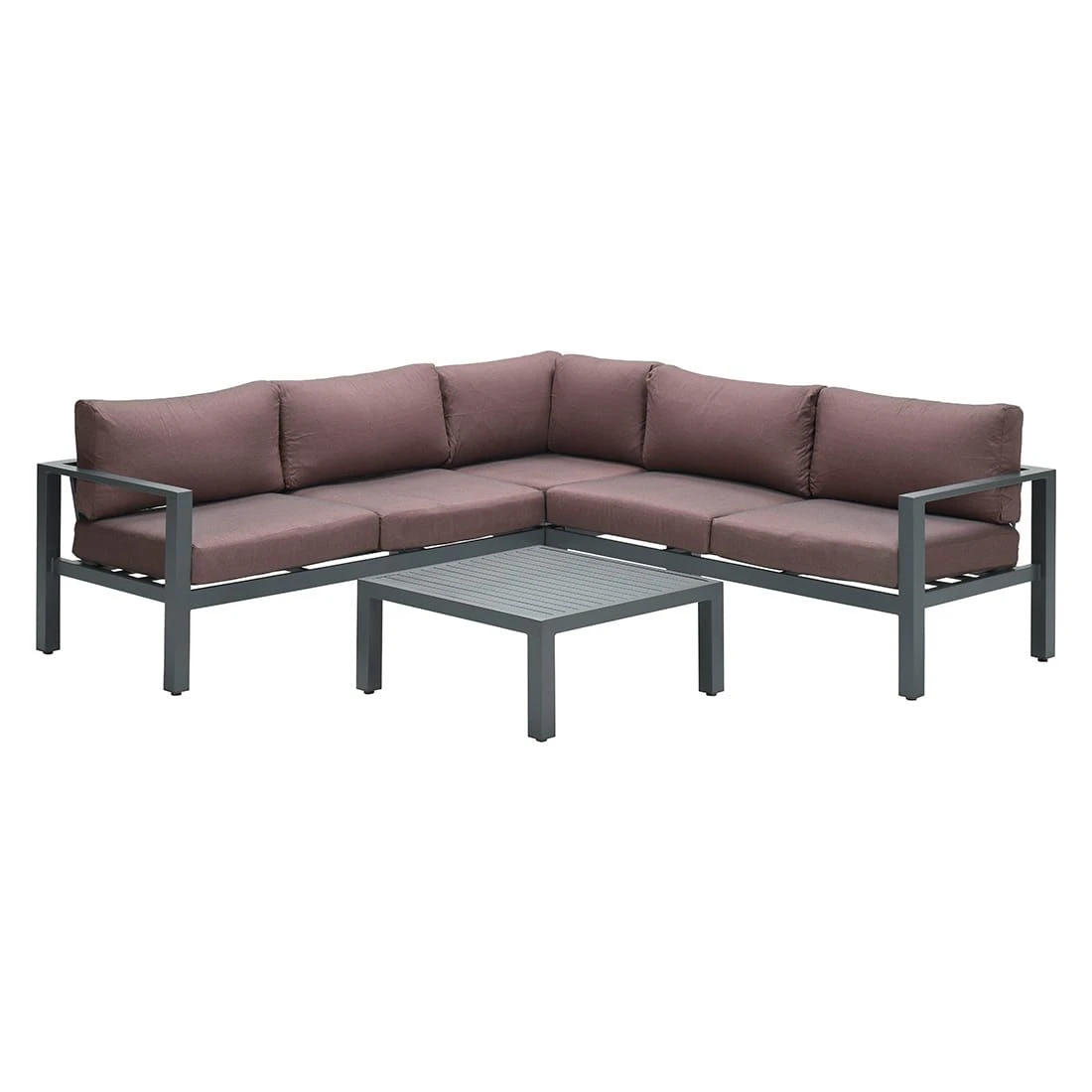 Für das Gestell und die Tischplatte kommt Aluminium zum Einsatz. Damit die Ecklounge optisch ansprechend ist, sind das Gestell und die Tischplatte im Farbton Carbon Black gehalten. Der Bezug der Ecklounge ist aus Polyester gefertigt. Für eine längere Haltbarkeit empfehlen wir bei stärkerem oder lang anhaltendem Regen, die abnehmbaren Kissen im Innenraum zu lagern. Die Farbe des Bezugs ist Copper.