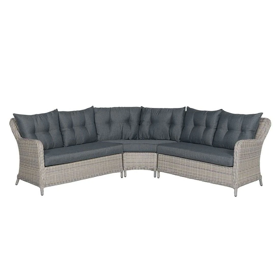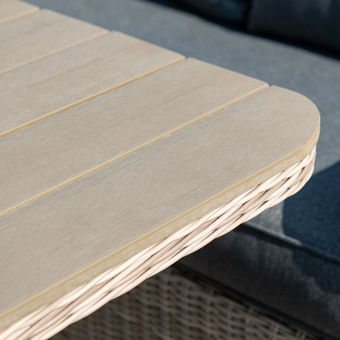 Damit die Dininglounge optisch ansprechend ist, sind der Korpus und die Sitzfläche im Farbton Vintage Willow gehalten. Das Gestell ist aus Aluminium hergestellt. Das Gestell, das mit hochwertigem Polyrattan umflochten ist, bringt ein exklusives Ambiente auf Ihre Terrasse. Dieses Material zeichnet sich durch eine hohe Wetterbeständigkeit aus. Als Bezug für die Sitz- und Rückenkissen wird der Outdoorstoff Spun Polyester verwendet. Dieses Material ist besonders wetterfest. Die hohe UV-Beständigkeit lässt die Farben zudem lange strahlen. Die Farbe des Bezugs ist Reflex Black. Als Material für die Tischplatte wird hochwertiger und leicht zu reinigender Kunststoff in Holzoptik verwendet. Farblich überzeugt die Tischplatte in Kubu.