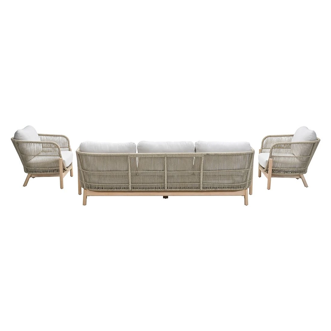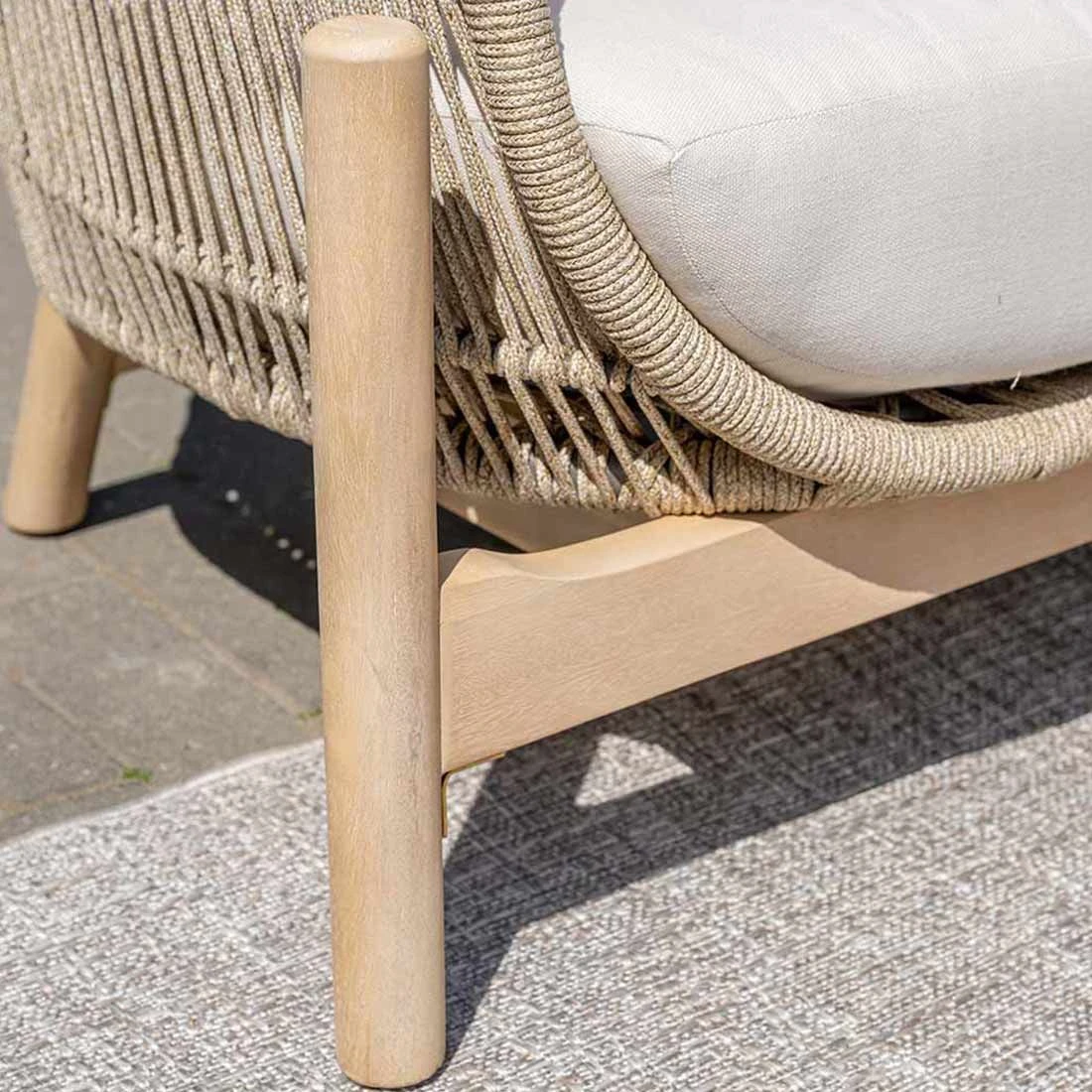 Allen Holzliebhabern wird gefallen, dass das Gestell des Loungesets aus hochwertigem Akazienholz gefertigt wird. Optisch begeistert das Gestell in der Farbe Akazie White Wash. Das Gestell ist mit Rope umflochten und bringt somit ein gemütliches Flair auf Ihre Terrasse. Der Korpus ist farblich in geschmackvollem Beige gestaltet. Der Bezug des Loungesets ist aus Polyester gefertigt. Für eine längere Haltbarkeit empfehlen wir bei stärkerem oder lang anhaltendem Regen, die abnehmbaren Kissen im Innenraum zu lagern. Die Farbe des Bezugs ist Sand. Die Tischplatte ist aus Polystone gefertigt und dadurch für den Einsatz auf der Terrasse, im Garten und auf dem Balkon geeignet. Passend zum Gesamtbild des Loungesets begeistert die Tischplatte mit ihrer Farbgebung in Weiß-Grau Meliert.