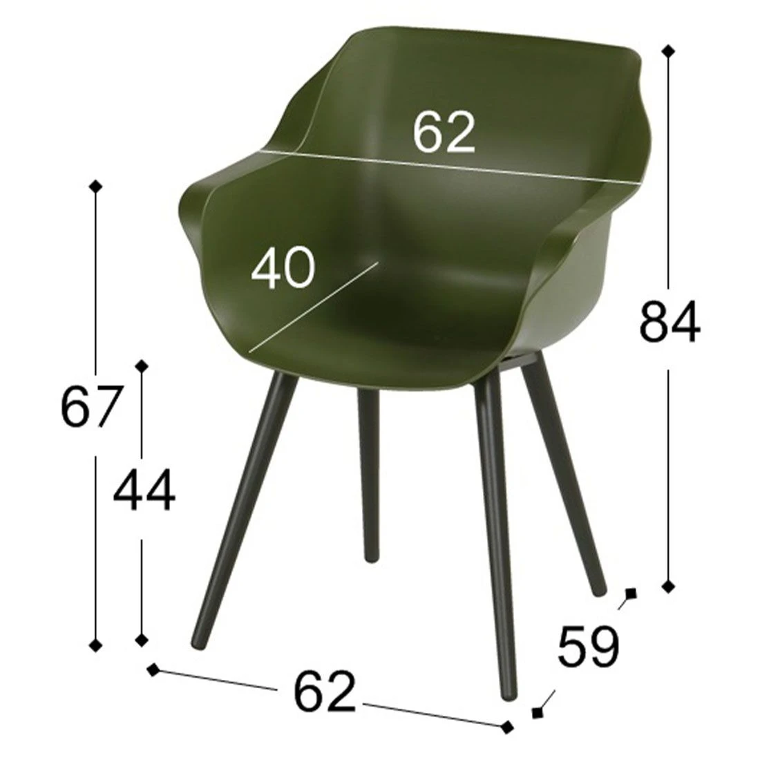 Das Gestell besteht aus pflegeleichtem und wetterfestem Aluminium. Für eine attraktive Optik ist das Gestell im Farbton Carbon Black gehalten. Die Sitzfläche besteht aus praktischem Kunststoff. Die Farbgestaltung der Sitzfläche in Moss Green ist überaus ansprechend.