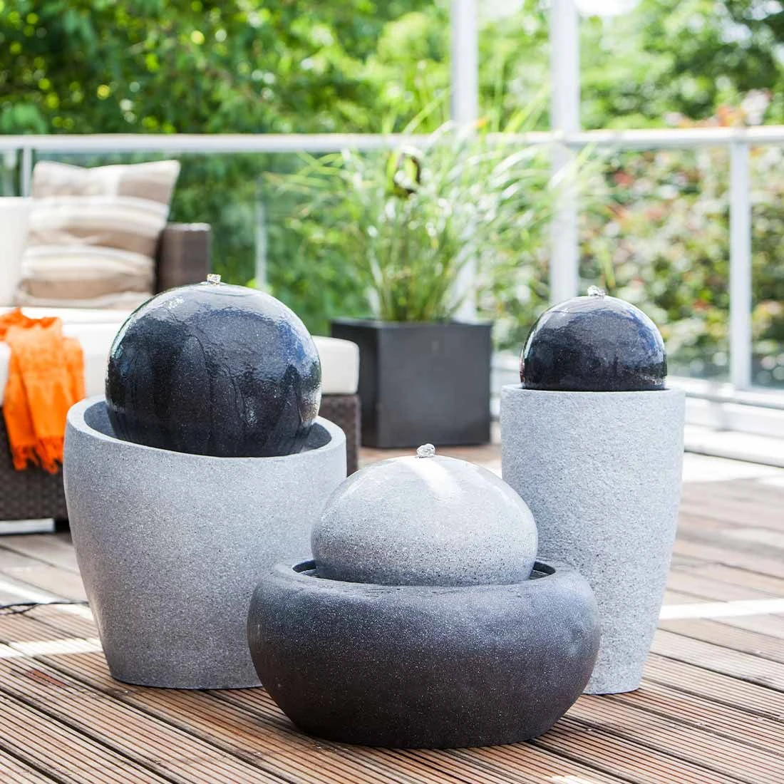 Die dunkle Kugel und der granitfarbene Sockel wirken, als wäre sie aus edlem Granitstein gefertigt. Selbst beim Anfassen spüren Sie kaum einen Unterschied zu echtem Stein. Es handelt sich dabei aber um das sogenannte Material Polystone, das sehr langlebig und robust ist. Polystone wird aus mineralischem Material gefertigt, das mit einem Acrylharz und Farbpigmenten vermischt wird. So entsteht die charakteristische Steinoptik. Der Vorteil: Im Gegensatz zu natürlichen Steinen ist Polystone resistent gegenüber Säuren und Laugen und verfärbt sich in der Regel nicht.