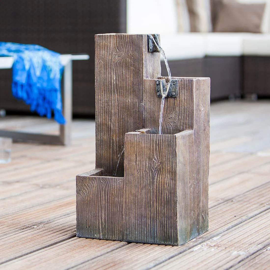 Der Säulenbrunnen wirkt, als wäre er aus echtem Holz gefertigt. Selbst beim Anfassen spüren Sie kaum einen Unterschied zu echtem Holz. Es handelt sich dabei aber um das innovative und leichte Material Polyresin, das sich durch eine hohe UV-Beständigkeit auszeichnet und bruchsicher ist. Mit diesem Werkstoff lässt sich nahezu jedes Naturmaterial nachbilden.