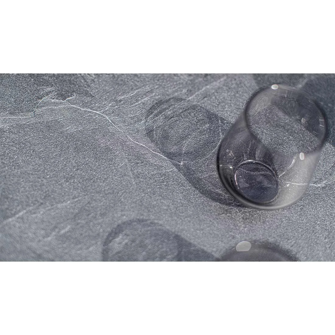 Eine herrliche Optik bietet Ihnen die Tischplatte aus HPL-Kunststoffverbund. Diese natürlich gehaltene Tischplatte ist zudem beständig gegen Frost und Hitze bis maximal 180 °C. Farblich ist die Tischplatte in einem schönen Jura Anthrazit gehalten.