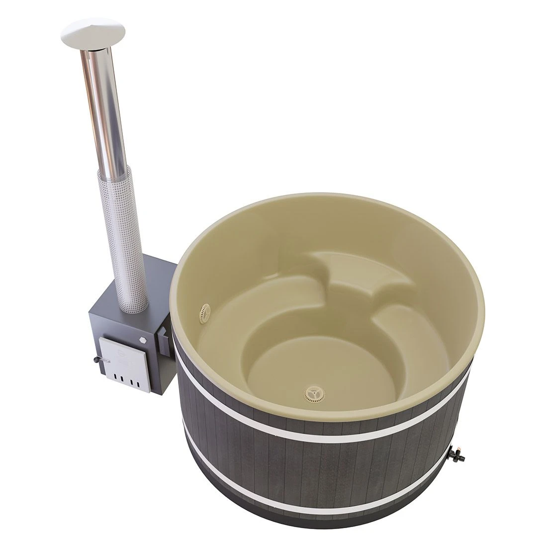 Als Außenofen kommt der grau gehaltene Macu zum Einsatz, der sich ideal zum Beheizen mittelgroßer Badefässer eignet. Er wurde aus hochwertigem Meeresaluminium gefertigt, was eine äußerst gute Wärmeleitfähigkeit sicherstellt. Als Außenverkleidung dienen zeitlose, nachtschwarze Paneele aus recyceltem Kunststoff, die sich für ein modernes Umfeld eignen. Die glatte Oberfläche lässt sich leicht reinigen und erfordert abgesehen von der Wäsche keine Instandhaltung. Die durchscheinende, caramel-beige Innenfarbe ist eine milde und gemütliche Wahl. Die sanfte Innenfarbe ist stets stilvoll und bietet angenehmes, cremiges Baden an.