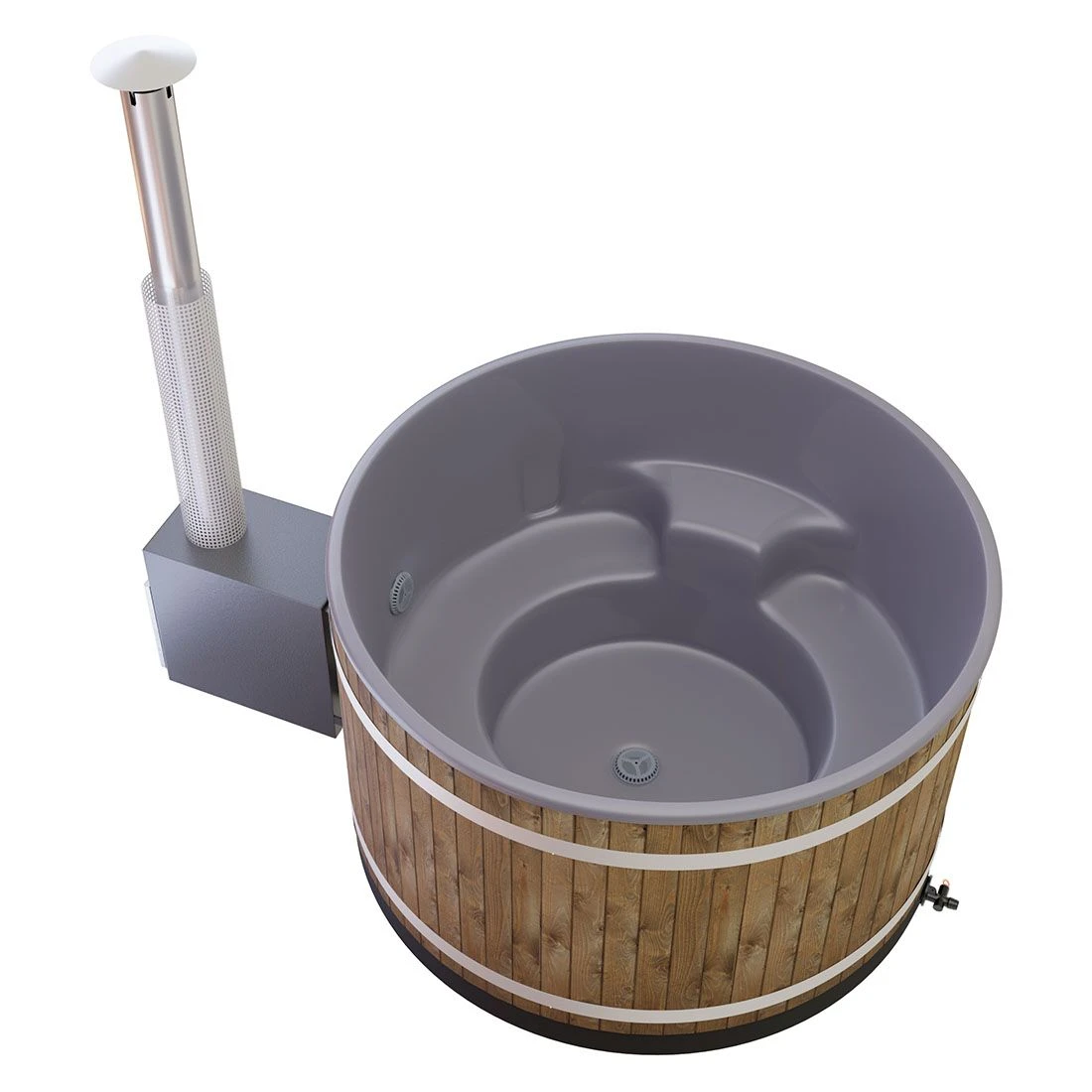 Als Außenofen kommt der grau gehaltene CULT-si zum Einsatz, der sich ideal zum Beheizen kleiner Badefässer eignet. Er wurde aus hochwertigem Meeresaluminium gefertigt, was eine äußerst gute Wärmeleitfähigkeit sicherstellt. Als Außenverkleidung dienen in einem dunkelbraunen Walnuss gebeizte Fichtenpaneele aus Finnland, deren schönes Erscheinungsbild lange erhalten bleibt. Die durchscheinende, graue Innenfarbe ist einfaches und sorgloses Wahl. Eine graue Innenwanne ist stets zeitlos, stilvoll und fügt sich toll in die Umgebung ein.
