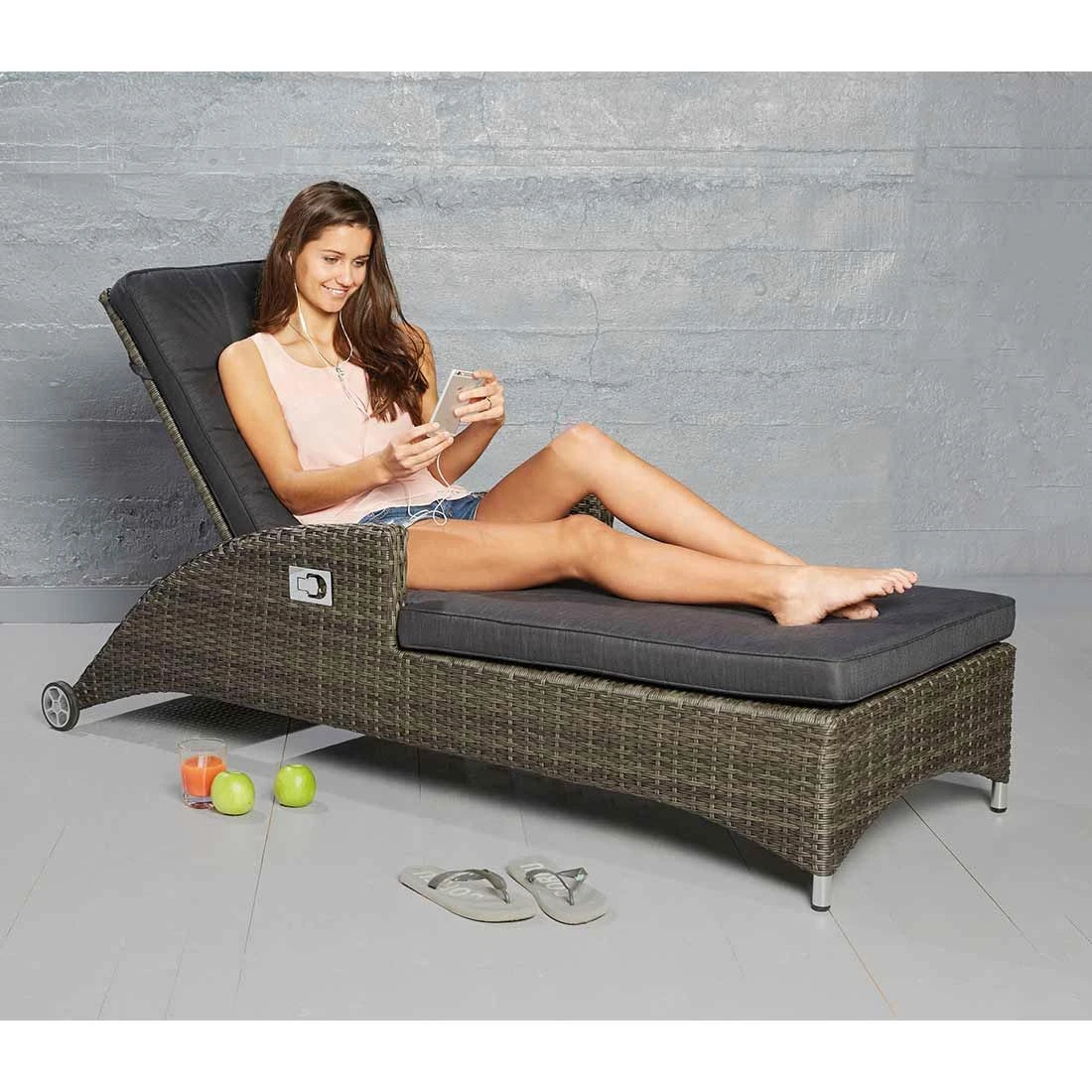 Für die Herstellung des Gestells wird hochwertiges und wetterfestes Aluminium verwendet. Ein hochwertiges Polyrattan-Geflecht umgibt das robuste Gestell und verleiht der Gartenliege damit einen ganz besonderen Look. Die Sitzfläche der Gartenliege wird mit Polyester bespannt. Den finalen Schliff erhält diese Gartenliege durch den Bezug in Schwarz. Damit die Gartenliege optisch ansprechend ist, sind der Korpus und die Sitzfläche im Farbton Grau Mix gehalten.