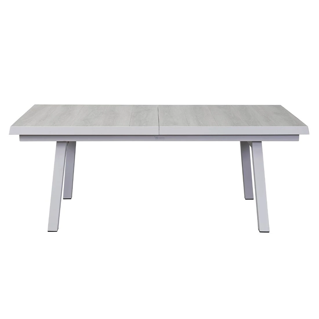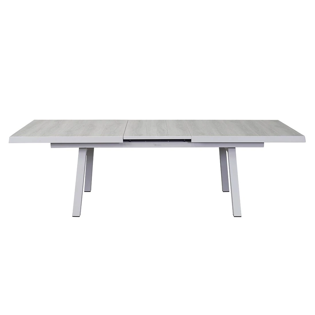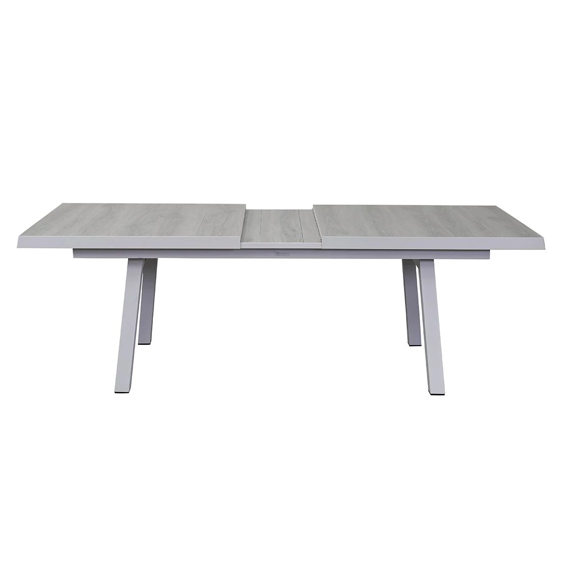 Als Gestellmaterial dient modisches Aluminium. Klassisch aus vier Tischbeinen besteht das Gestell des Tisches. Für die Tischplatte wird hochwertiges Keramik verwendet, welches auf der Terrasse und im Garten eine angenehme Wohlfühl-Atmosphäre erzeugt. Farblich ist die Platte in Easy Grey gehalten. Mit der rechteckigen Form lässt sich der Ausziehtisch platzsparend in Ecken oder an Häuserwänden aufstellen.