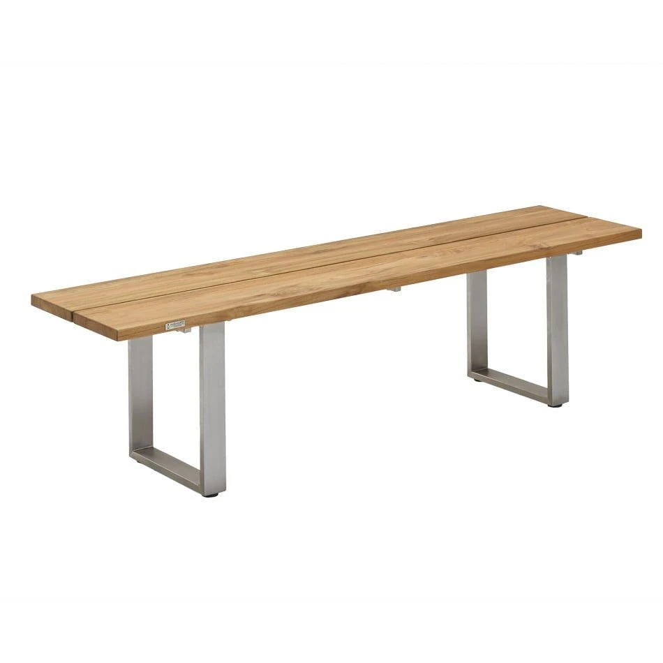 Das Gestell wird aus hochwertigem und rostfreiem Edelstahl hergestellt. Aufgrund des etwas höheren Eigengewichts, steht die Gartenbank dadurch besonders stabil und windsicher auf der Terrasse. Für eine attraktive Optik ist das Gestell im Farbton Silber gehalten. Als Ergänzung zum Gestell wartet die Gartenbank mit einer Sitzfläche aus Teakholz auf. So gelingt es, das Möbelstück mit einer guten Wetterfestigkeit besonders robust zu gestalten. Die Farbgestaltung der Sitzfläche in Teak Natur ist äußerst ansprechend.