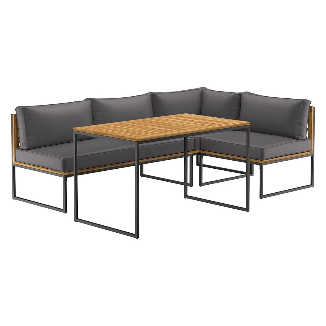 Das Gestell wird aus robustem Stahl in der Farbe Schwarz gefertigt. Der Bezug der Dininglounge ist aus Polyester gefertigt. Auch wenn der Bezugsstoff Wind und Wetter trotzen kann, empfehlen wir, abnehmbare Kissen bei länger andauernder Feuchtigkeit und im Winter drinnen zu lagern.