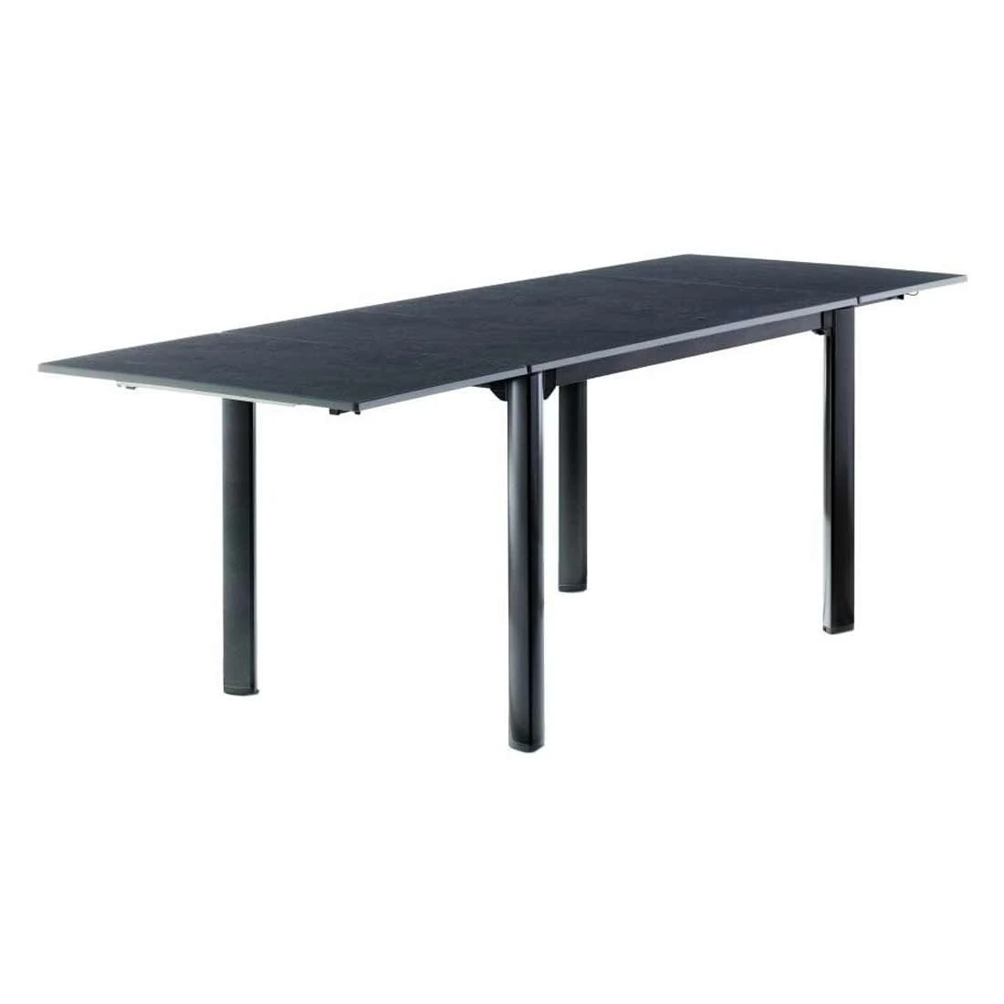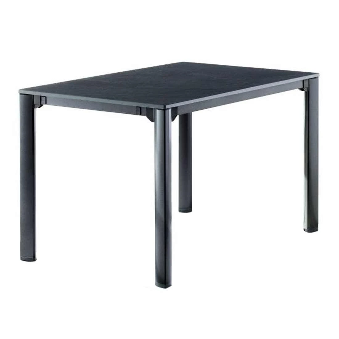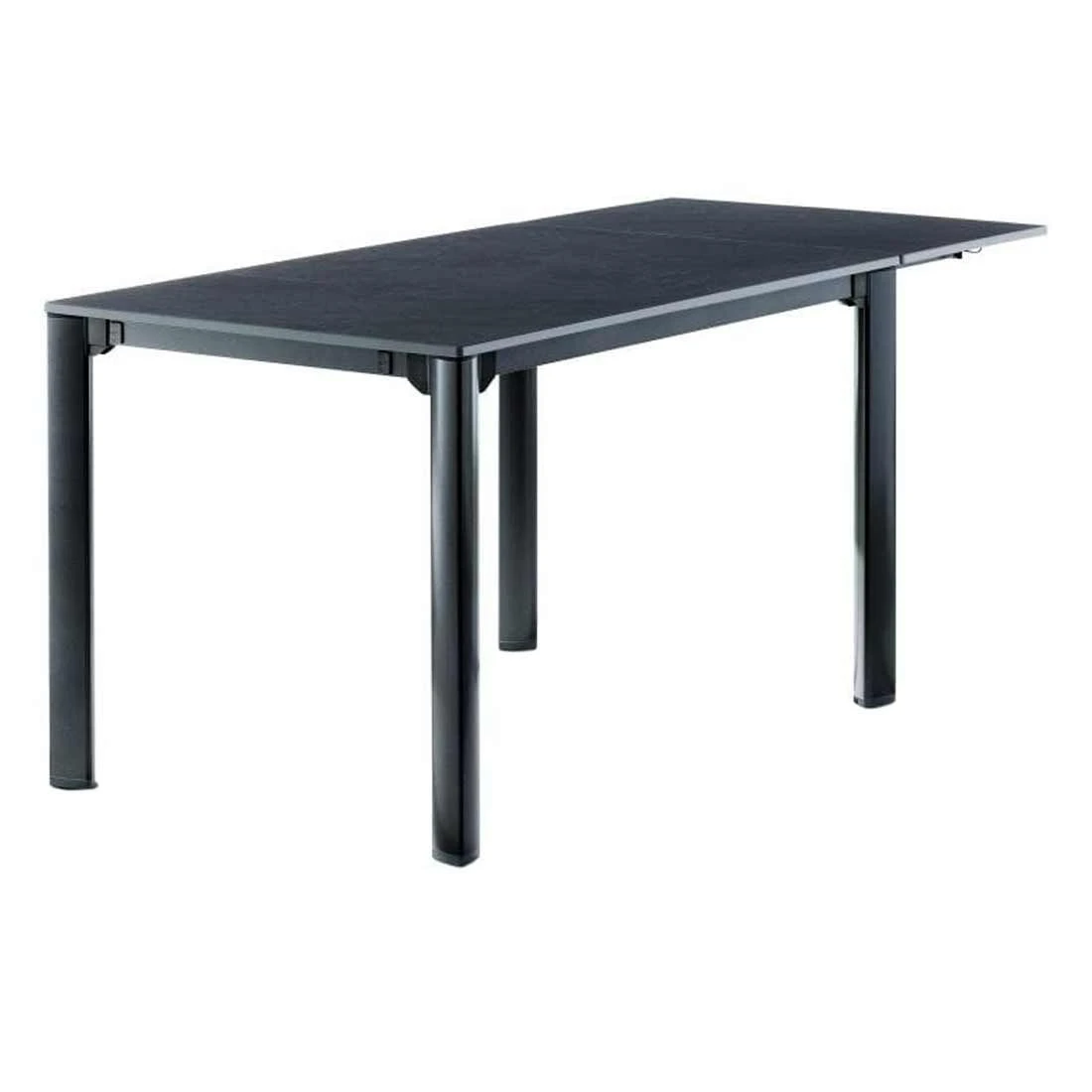 Das Gestell des leichten Tisches besteht aus Aluminium. Klassisch aus vier Tischbeinen besteht das Gestell des Tisches. Das Material, das für die Tischplatte verwendet wird, heißt „Vivodur“. Dabei handelt es sich um eine mit Melamin beschichtete Spanplatte. Durch die Beschichtung ist die Platte wetter- und kälteresistent sowie schlagfest und damit die perfekte Outdoor-Tischplatte. Farblich ist die Platte in Schiefer Anthrazit gehalten. Der Ausziehtisch ist klassisch rechteckig gestaltet.