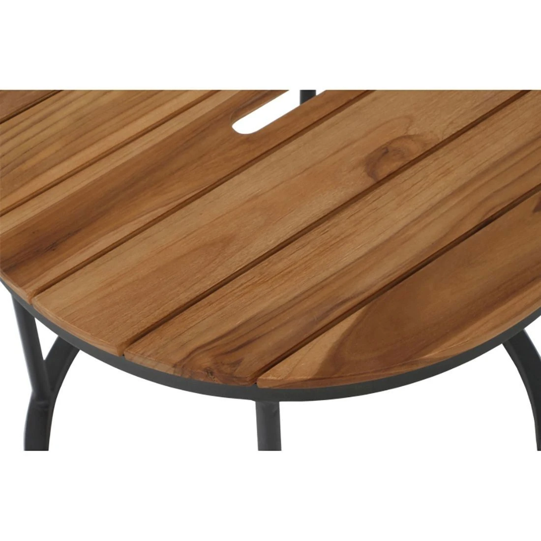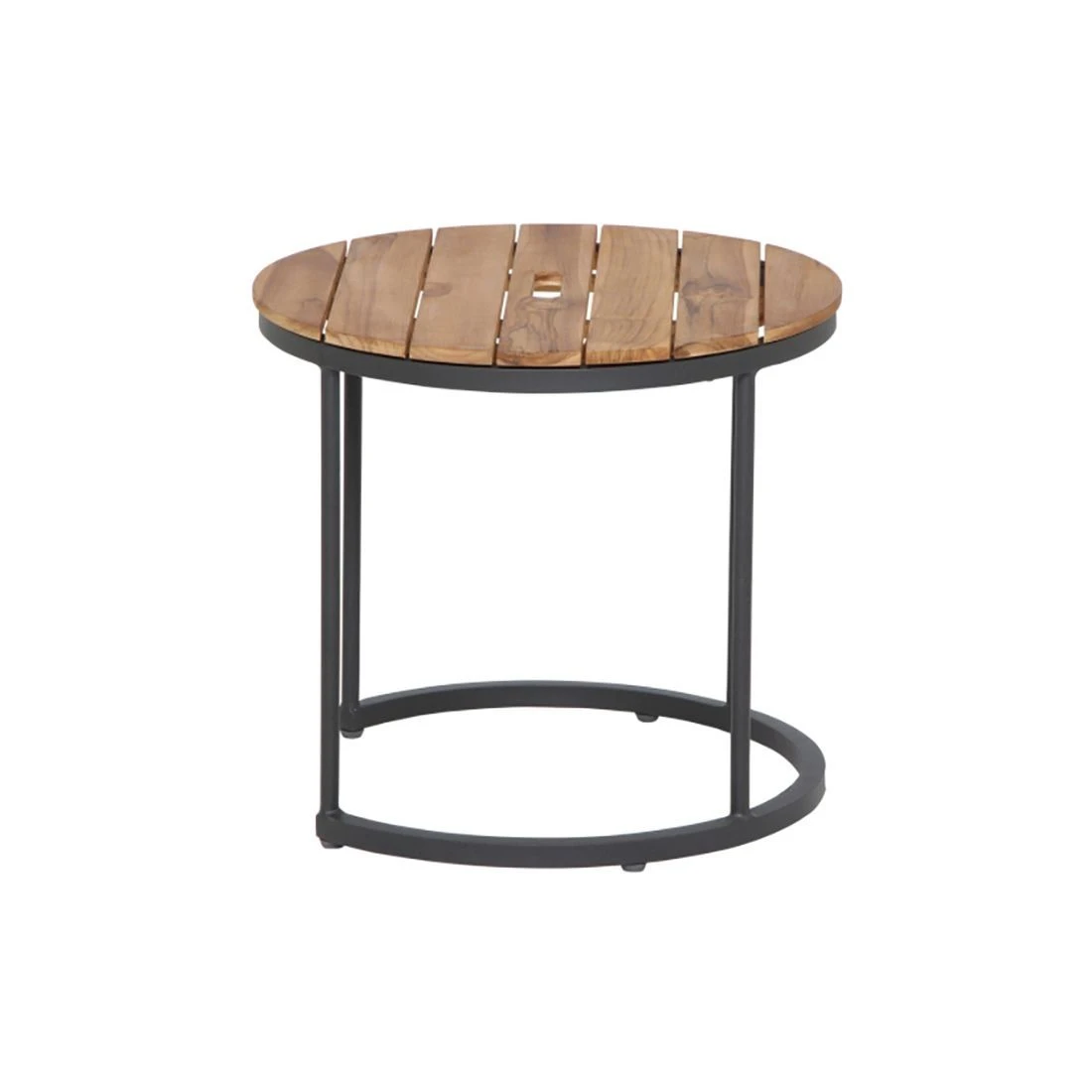 Das Gestell des leichten Tisches besteht aus Aluminium. Ein stabiler Unterbau und dabei gleichzeitig dekorativ ist das Säulengestell. Als Material für die Tischplatte wird das wertvolle Hartholz Teak verwendet. Die Maserung des Holzes und der gemütliche Farbton integrieren sich äußerst gut in jegliche Arten der Garten- und Balkongestaltung und verbreiten eine einzigartig natürliche Atmosphäre. Farblich ist die Platte in Teak Natur gehalten. Der Beistelltisch ist in seinem Design klassisch rund gefertigt.