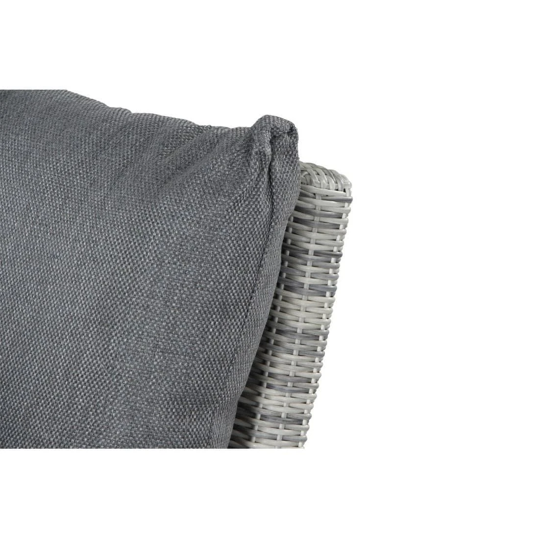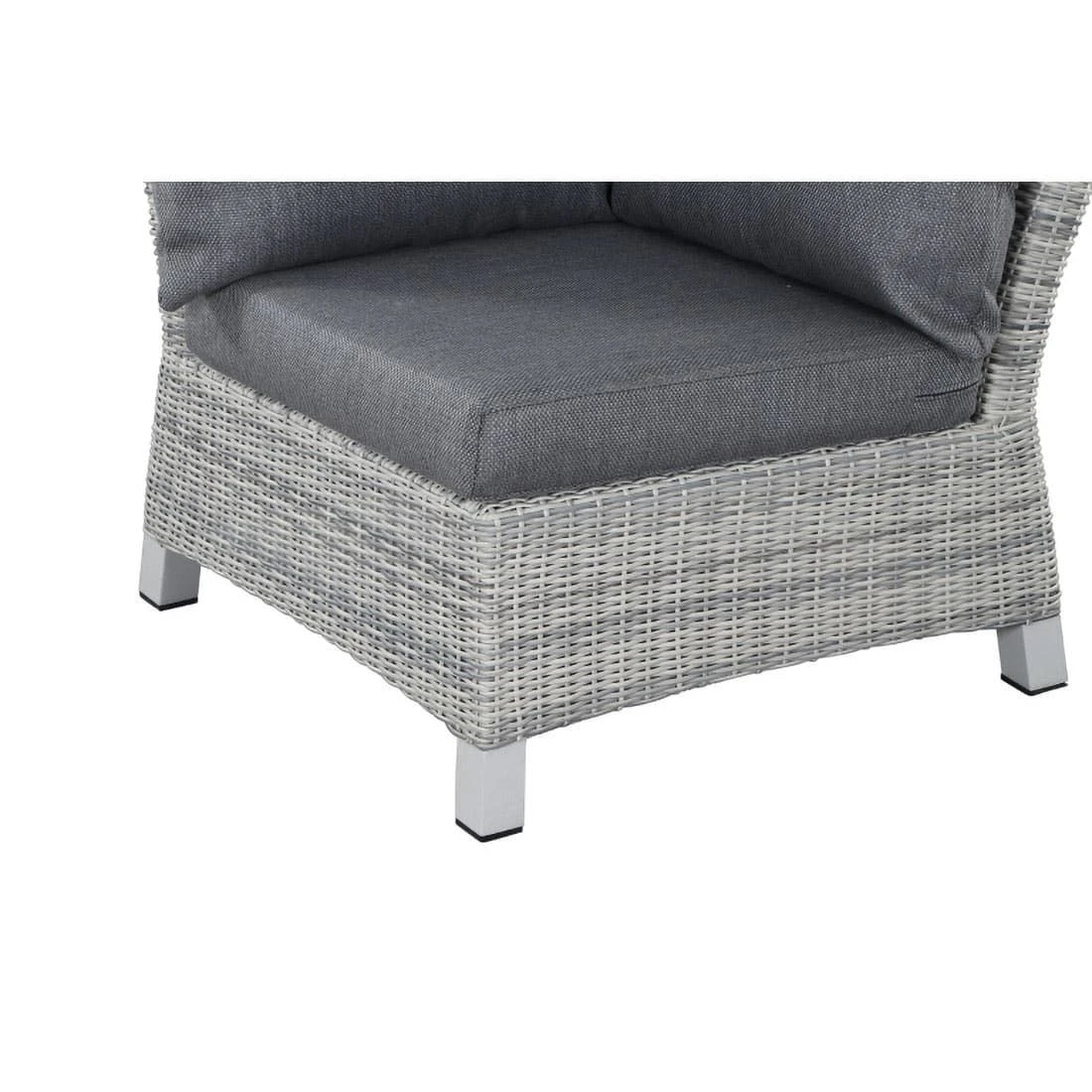 Der Korpus und die Sitzfläche bestehen aus Gardino®-Geflecht. Damit das Eck-/Endmodul optisch ansprechend ist, sind der Korpus und die Sitzfläche im Farbton Ice Grey gehalten. Als Gestellmaterial hat der Hersteller hochwertiges Aluminium gewählt. Optisch begeistert das Gestell in der Farbe Weiß-Grau matt. Als Bezug wird Polypropylen verwendet. Dieses Material ist besonders wetterfest. Die Farbe des Bezugs ist Stone Grey.