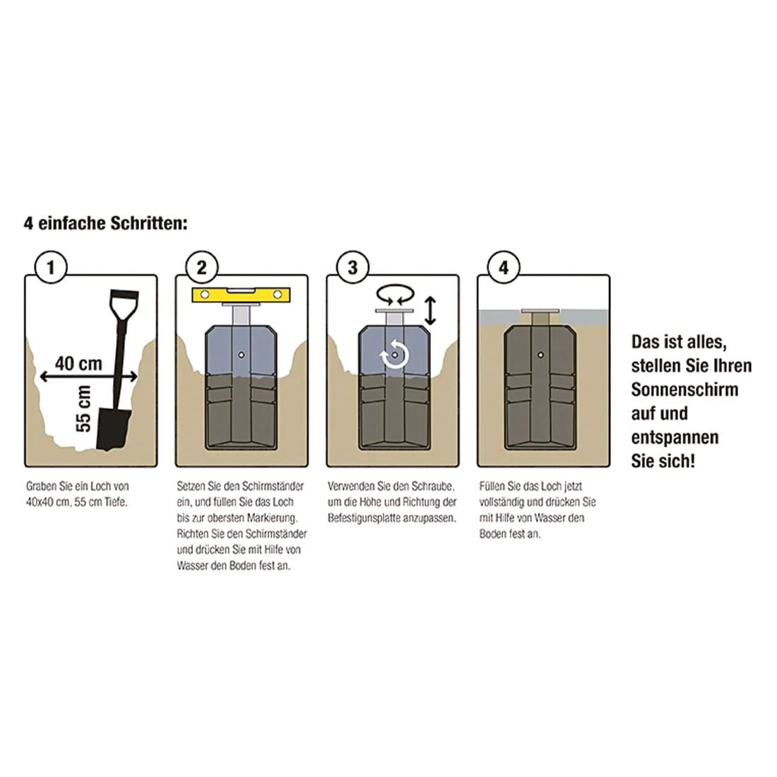 Bei Einsatz von Bodenhülsen empfehlen wir vor dem Einbetonieren eine Testmontage der Hülse an den Schirm.