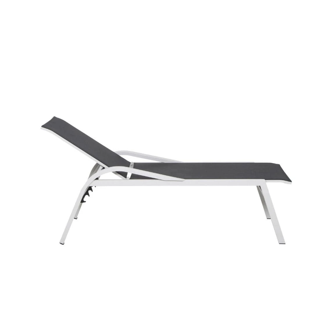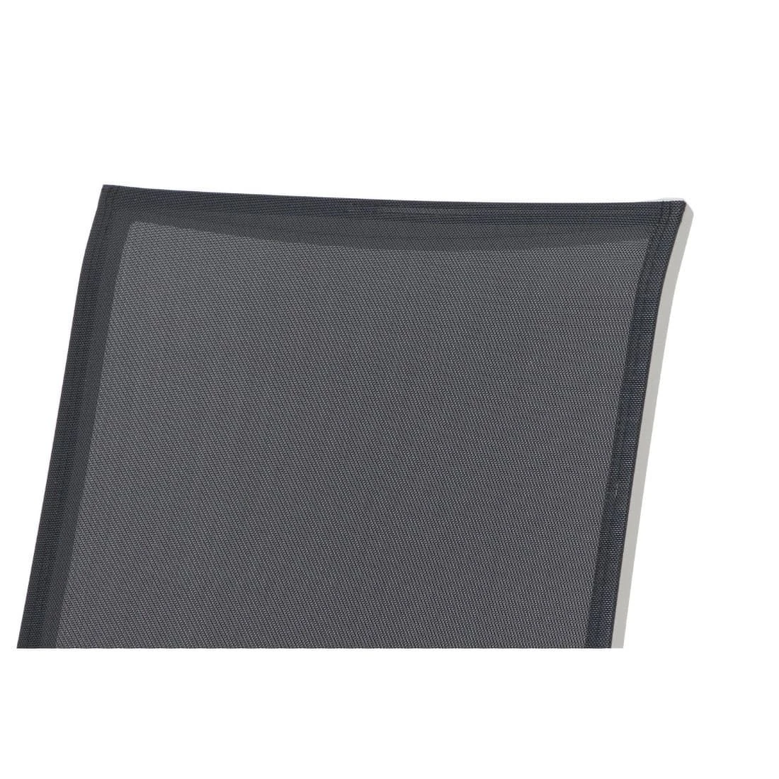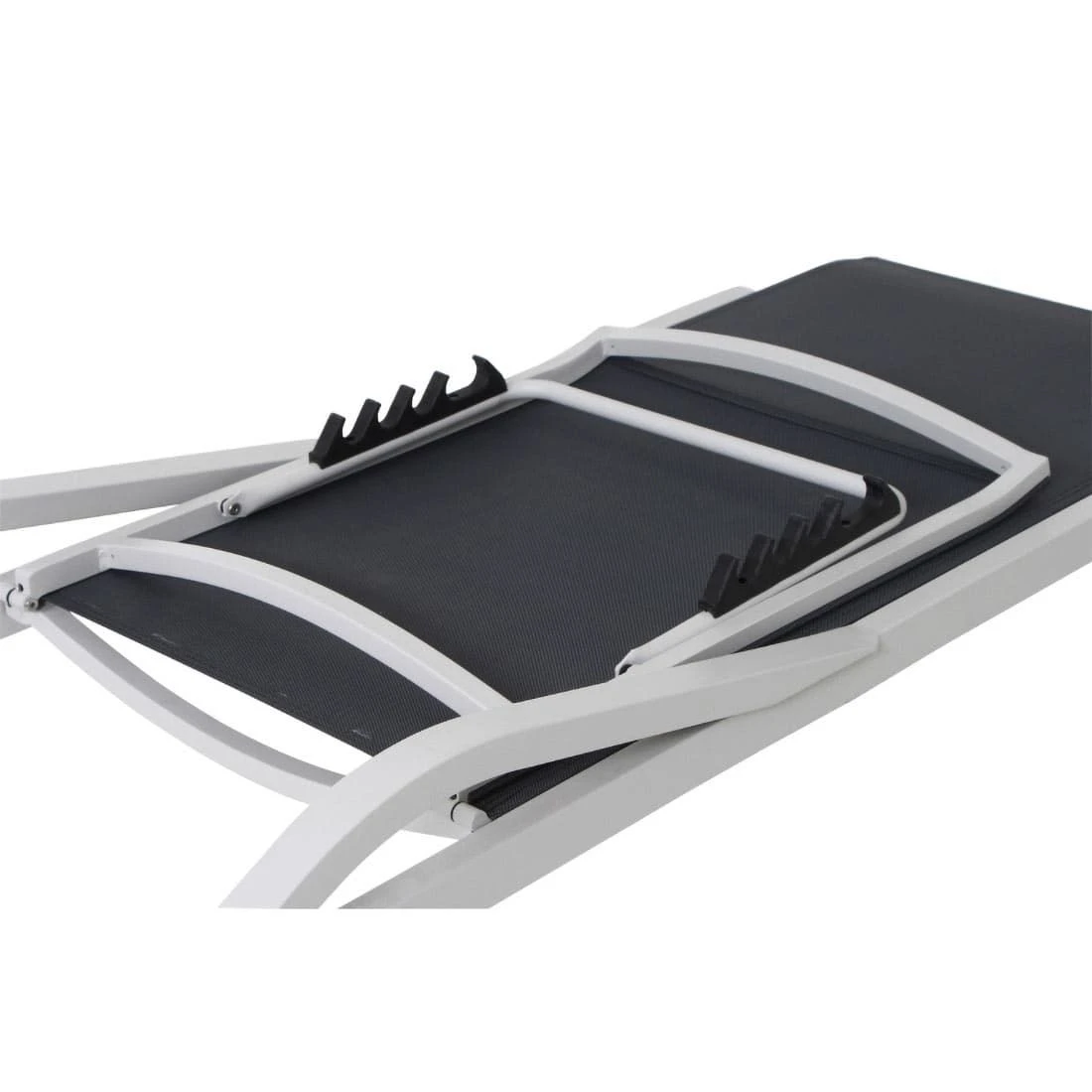 Für die Herstellung des Gestells wird hochwertiges und wetterfestes Aluminium verwendet. Farblich ist dieses in Weiß-Grau matt gehalten. Für die Bespannung der Sitzfläche wird hochwertiges Ranotex-Gewebe verwendet. Es besteht aus PVC-ummantelten Polyesterfasern und zeichnet sich durch eine hohe UV-Beständigkeit und Luftdurchlässigkeit aus. Dadurch trocknet das Material sehr zügig. Die Sitzfläche hat eine schöne Farbgebung in Silber-Schwarz.