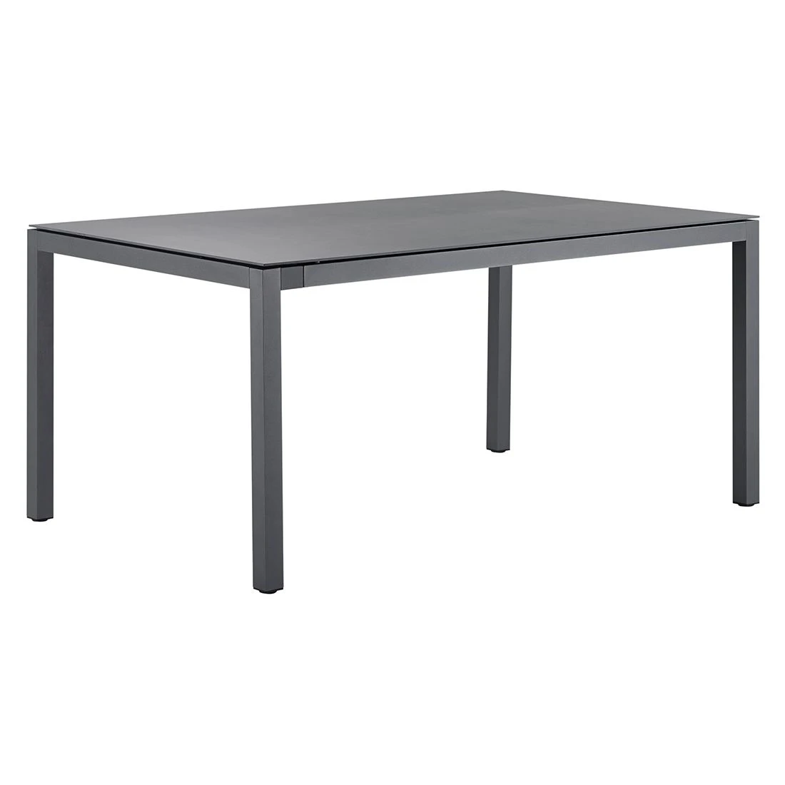 Als Material des Gestells dient wertiges Aluminium. Als klassische Design-Komponente fungiert das geradlinige Vierfußgestell. Keramik ist das Material, das für die Tischplatte gewählt wird. Das robuste Material ist nicht so schwergewichtig wie Naturstein, sorgt allerdings ebenso für windsicheren Halt im Garten oder auf der Terrasse. Farblich ist die Platte in Bromo gehalten. Mit der rechteckigen Form lässt sich der Gartentisch platzsparend in Ecken oder an Häuserwänden aufstellen.