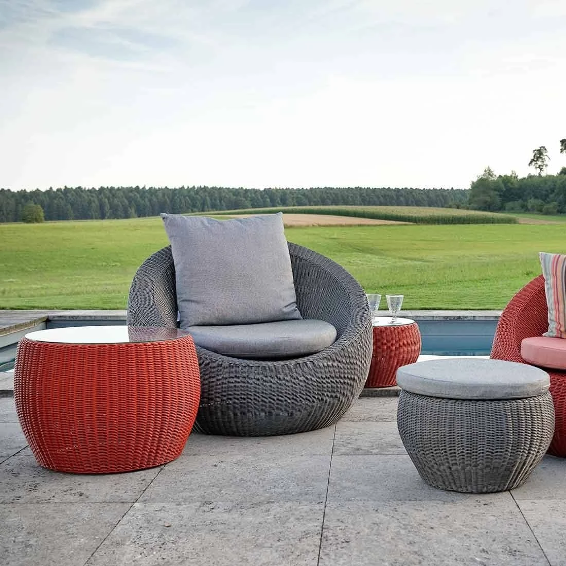 Das Gestell besteht aus pflegeleichtem und wetterfestem Aluminium in der Farbe Basaltgrau. Ein Material, das mit seiner Robustheit überzeugt. Das Gestell, das mit hochwertigem Polyrattan umflochten ist, bringt ein exklusives Flair auf Ihre Terrasse. Dieses Material zeichnet sich durch eine hohe Wetterbeständigkeit aus. Die Sitzfläche ist mit einem outdoortauglichen und komfortablen Stoff bezogen. Auch wenn dieser Wind und Wetter trotzt, empfehlen wir, die abnehmbaren Kissen bei länger andauernder Feuchtigkeit in der Wohnung bzw. in Ihrem Haus zu lagern.