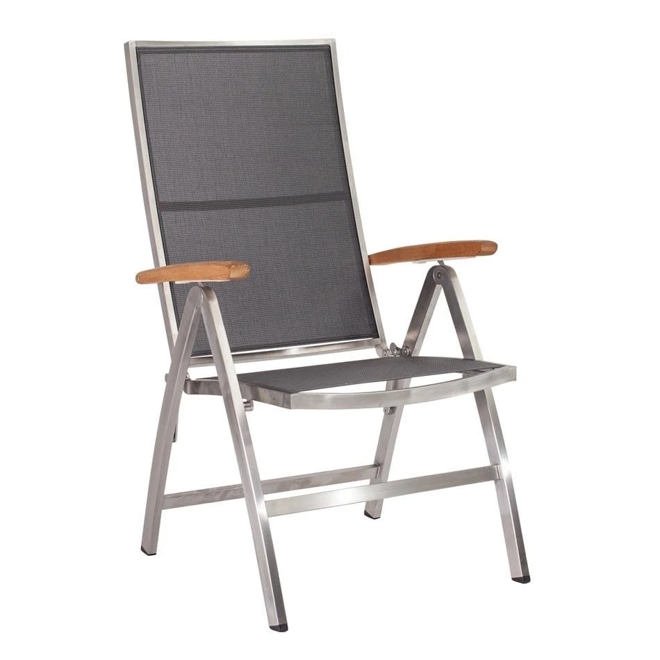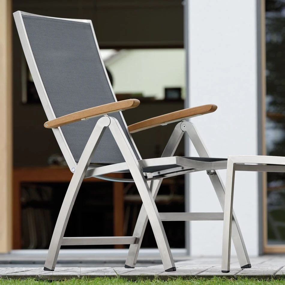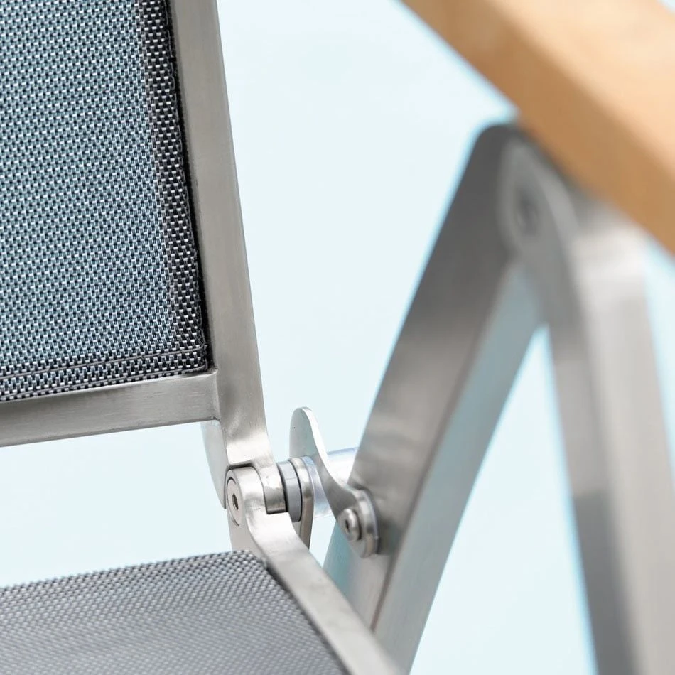 Das Gestell wird aus hochwertigem und rostfreiem Edelstahl hergestellt. Aufgrund des etwas höheren Eigengewichts, steht der Klappsessel dadurch besonders stabil und windsicher auf der Terrasse.