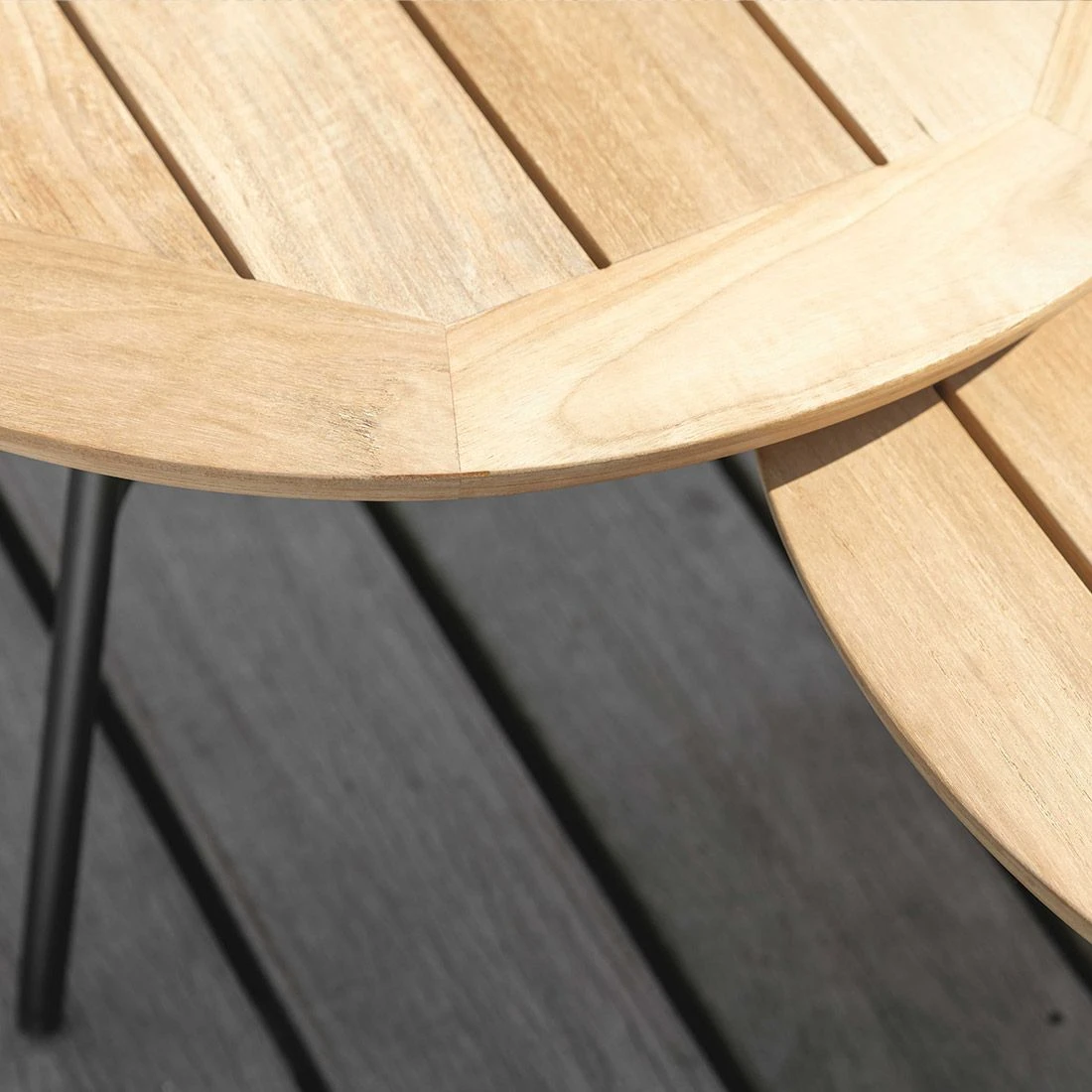 Das Gestell ist aus Aluminium gefertigt. Optisch begeistert das Gestell in der Farbe Schwarz. Der Bezug ist aus robustem Outdoorstoff gefertigt, der Wind und Wetter gut standhält. Bei langen Feuchtigkeitsperioden empfehlen wir dennoch, für eine längere Haltbarkeit, eine Lagerung der abnehmbaren Kissen im Inneren. Die Farbe des Bezugs ist Seidenschwarz. Beim Tischplatten-Material handelt es sich um Massivholz, weshalb Sie das Loungeset optimal im Garten oder auf der Terrasse verwenden können. Passend zum Gesamtbild des Loungesets begeistert die Tischplatte mit ihrer Farbgebung in Natur.