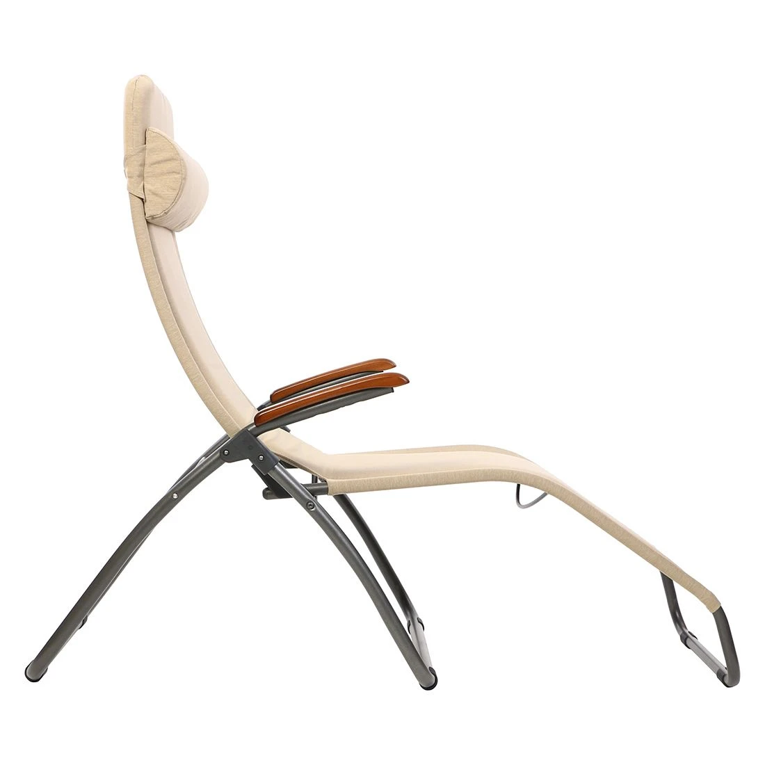 Für die Herstellung des Gestells wird hochwertiges und wetterfestes Aluminium verwendet. Für eine attraktive Optik ist das Gestell im Farbton Anthrazit gehalten. Die Sitzfläche der Bäderliege wird mit Olefin bespannt. Die Sitzfläche ist in ansprechendem Beige gehalten.