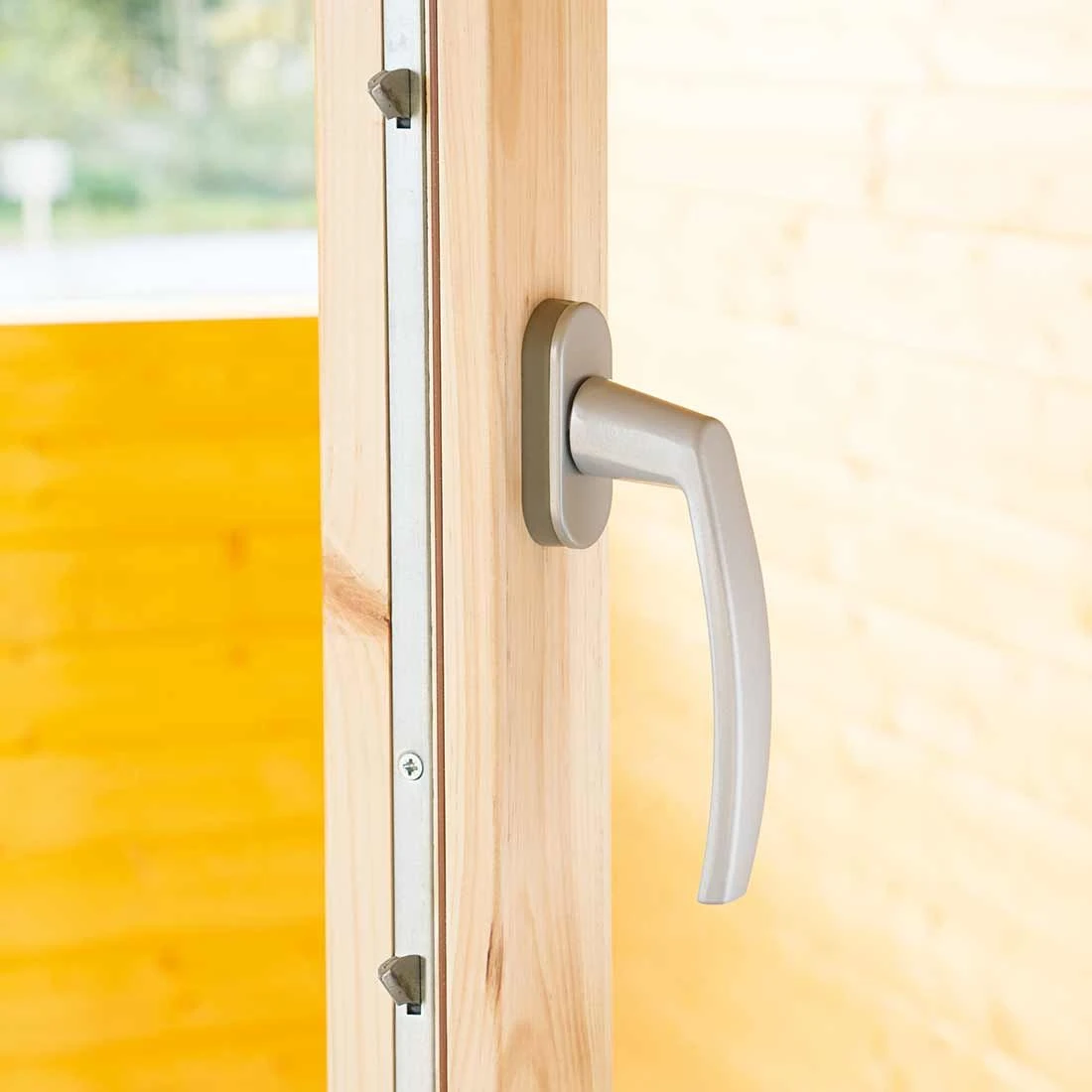 Weiterhin zeigt sich die hochwertige und optisch ansprechende Verarbeitung des Gartenhauses in der verglasten Leimholz-Doppeltür, die mit einer Drückergarnitur, einem Einsteckschloss und Profilzylinder ausgestattet ist. Durch die Verwendung von echtem Glas wird ein vorzeitiges Verkratzen verhindert und das Gartenhaus behält seine edle Optik.