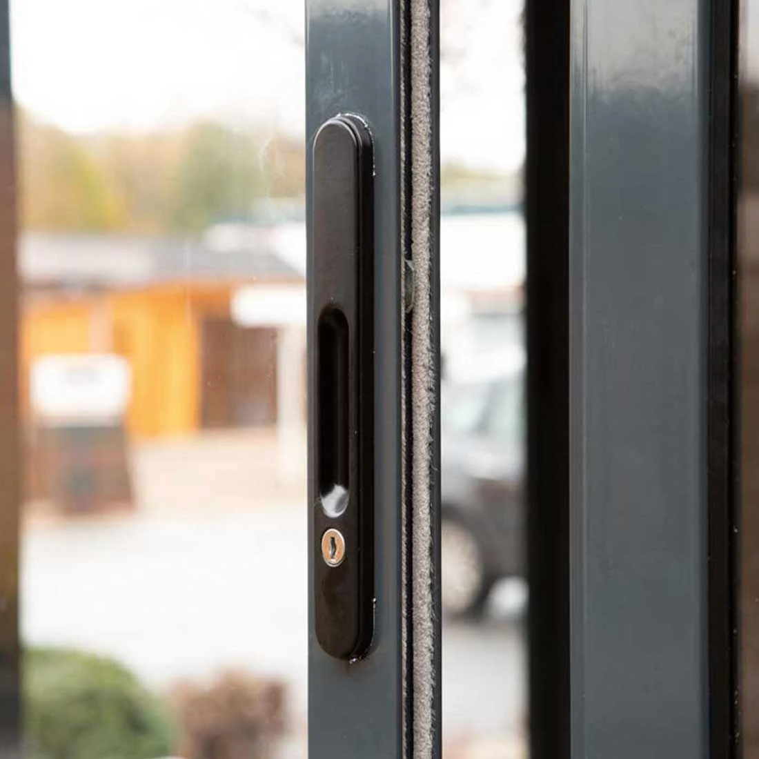 - Eckverkleidung und Rahmen der Schiebetür in anthrazitfarbenem Aluminium
